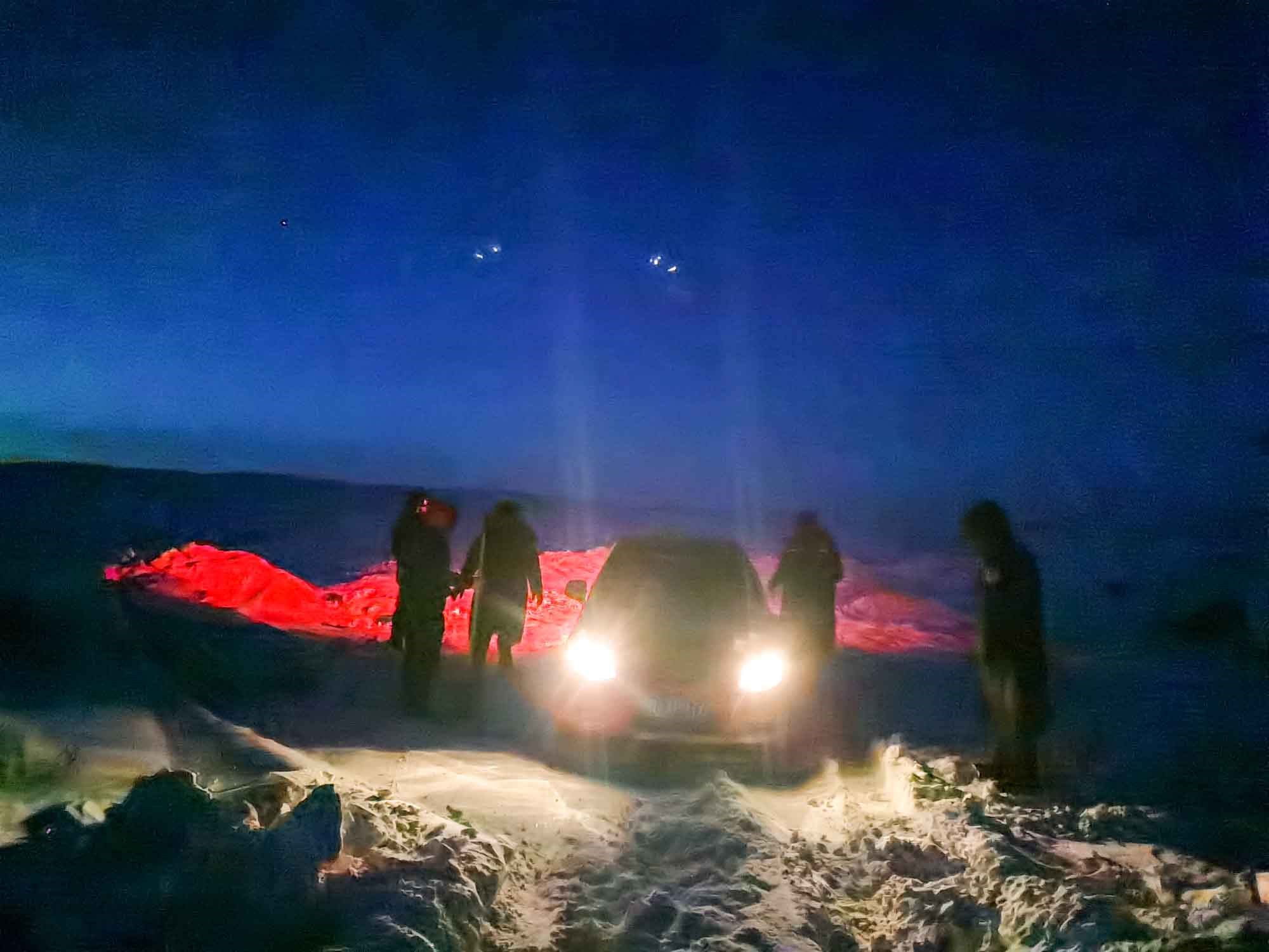 1月17日17時,那木吉拉與弟弟一同駕車返回百靈廟鎮(zhèn),在途經(jīng)一處被風(fēng)谷地時,由于晚上視線較差,且此處坡度較大,不慎陷入雪中無法動彈,只得撥通電話請求派出所救助。草原上沒有遮蔽物,常常到了下午就刮起大風(fēng),吹得積雪覆蓋在土地上分不清地勢高低,民警們按著平日下鄉(xiāng)走訪的經(jīng)驗(yàn)摸索前進(jìn),經(jīng)過近一小時才到達(dá)現(xiàn)場,了解情況后,民警們將準(zhǔn)備好的熱水和棉大衣遞給牧民便展開了救援工作。在零下35度的冬夜里,民警們用鐵鍬和雙手經(jīng)過近兩個小時的奮戰(zhàn)終于將40厘米厚的積雪清理干凈,并將被困車輛通過前拉后推的方式移至平坦區(qū)域。