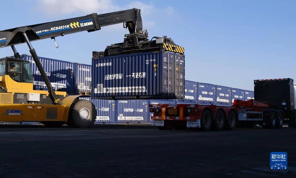 包頭市九原區(qū)“數(shù)字陸港”內,吊車從卡車上卸“甩箱”。新華社記者賈立君 攝