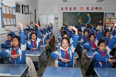 12月29日,臨河九小六年級的學生在下午第一節(jié)課課間,伴隨著音樂在教室座位上展示自編自排的創(chuàng)意操。圖為六(5)班同學們跟著歌曲《精忠報國》的節(jié)奏,或扭肩、或拍手,鏗鏘有力的歌聲激起了同學們“報效祖國,振興中華”的豪情壯志。針對課間時間短、下樓活動不方便等現(xiàn)狀,今年10月,臨河九小推出了課間創(chuàng)意操,每個班做的操不一樣,創(chuàng)意操一般在3分鐘之內(nèi)就可做完。(記者 張靜 楊曉軍 攝影報道)