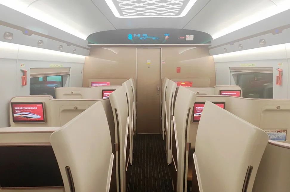 在空間布局方面,CR400BF-GS型動(dòng)車組通過設(shè)備小型化、集成化的措施,對(duì)車廂內(nèi)的整體平面布局進(jìn)行了優(yōu)化。車端占用空間得以縮小,客室空間相應(yīng)增大,列車定員由576人增至619人,顯著提高了動(dòng)車組列車的載客能力。