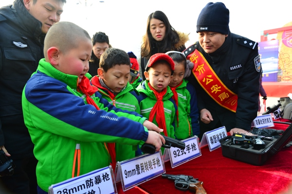 1月10日,民警為小朋友們講解槍支警械。當(dāng)日,是全國第33個“110宣傳日”,呼和浩特市公安局在如意廣場開展了“110宣傳日”活動?,F(xiàn)場,戰(zhàn)鷹突擊隊民警向市民介紹了槍支警械以及常用裝備,四旋翼無人機(jī)、定位儀、微光夜視儀等先進(jìn)設(shè)備?;顒幼屓罕娏憔嚯x接觸了難得一見的特種裝備,搭建起警民互動橋梁,增強(qiáng)市民的安全感。