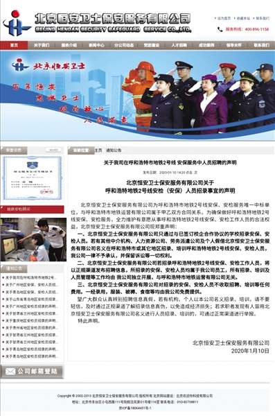 除了1號線和2號線安保,恒安衛(wèi)士還將為即將開通的地鐵2號線提供安檢服務(wù)。事實(shí)上,恒安衛(wèi)士近年來多次在全國多個城市引起地鐵安保安檢員高價招聘亂象。記者從恒安衛(wèi)士官網(wǎng)上看到,2015年9月至2020年1月,恒安衛(wèi)士先后發(fā)布20次聲明,就其公司在廣州、青島、南昌、南寧、蘭州、貴陽、重慶等城市引起高價招聘地鐵安檢、安保人員亂象做出辯解。最近的一次,則是1月20日發(fā)布的《關(guān)于我公司在呼和浩特市地鐵2號線安保服務(wù)中人員招聘的聲明》。
