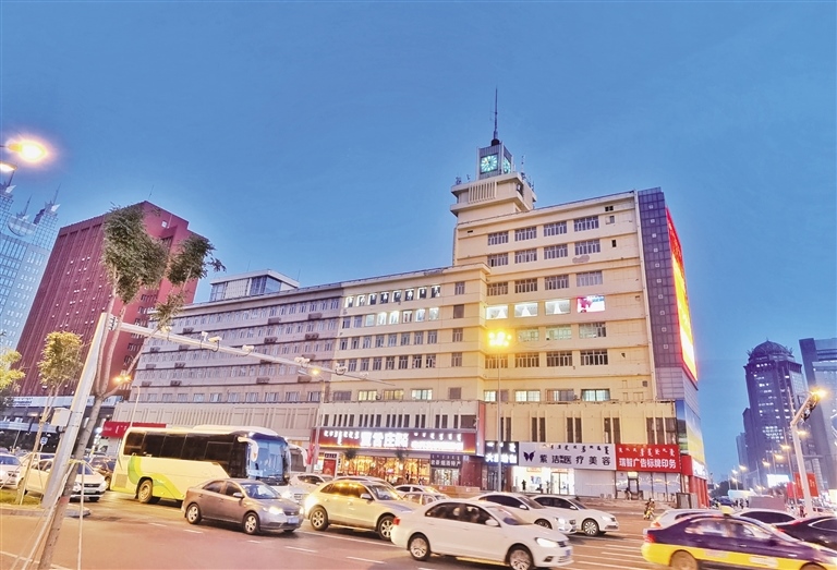 當日傍晚時分,天色漸暗,華燈初上,在斑斕的霓虹燈中,街道車水馬龍,人群熙熙攘攘,一派繁華都市的景象。這座建于1983年的景觀塔鐘,依然和30多年前一樣屹立在新華廣場東側的信息大廈樓頂,再次以“地標”姿態(tài)工作起來。