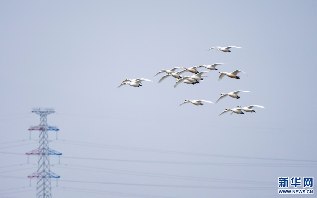 成群的天鵝在土默特左旗海流水庫(kù)上空飛翔。新華網(wǎng)發(fā)(陽(yáng)光 攝)