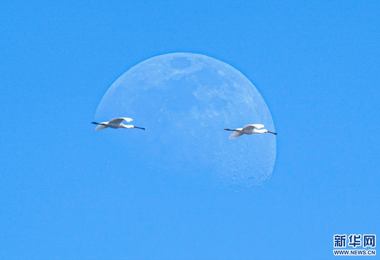 兩只候鳥在內(nèi)蒙古自治區(qū)土默特左旗海流水庫(kù)上空飛翔。新華網(wǎng)發(fā)(楊鑫 攝)