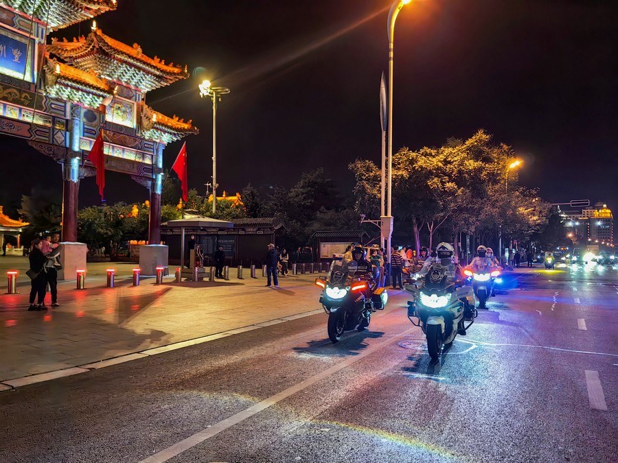 中秋、國(guó)慶兩節(jié)期間,呼和浩特市公安局反恐怖和特巡警支隊(duì)?wèi)?zhàn)鷹突擊隊(duì)與交警支隊(duì)停放管理大隊(duì)鐵騎中隊(duì),聯(lián)合開展巡邏防控工作,并組成了一支騎警處突機(jī)動(dòng)隊(duì),成了呼和浩特大街小巷一道亮麗的風(fēng)景線。圖為中秋節(jié)之夜,這支機(jī)動(dòng)隊(duì)開展聯(lián)合巡邏,守護(hù)青城百姓平安過節(jié)。 王鑫 攝影報(bào)道