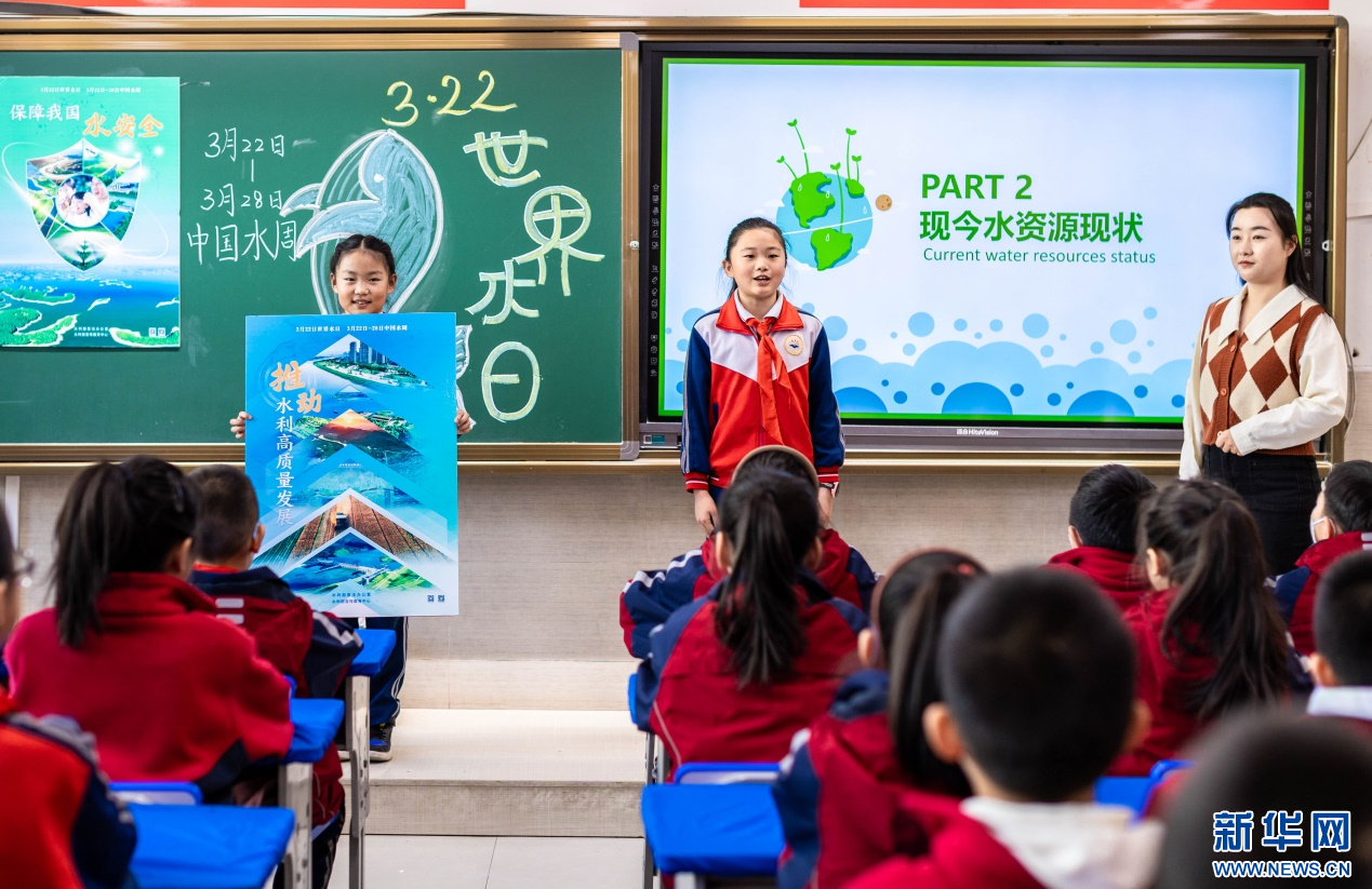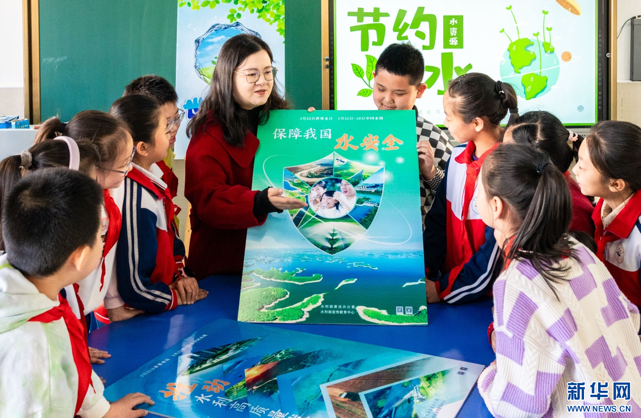 ??3月20日,呼和浩特市玉泉區(qū)石東路小學老師向學生們講解“保障我國水安全”等知識。新華網(wǎng)發(fā)(丁根厚 攝)