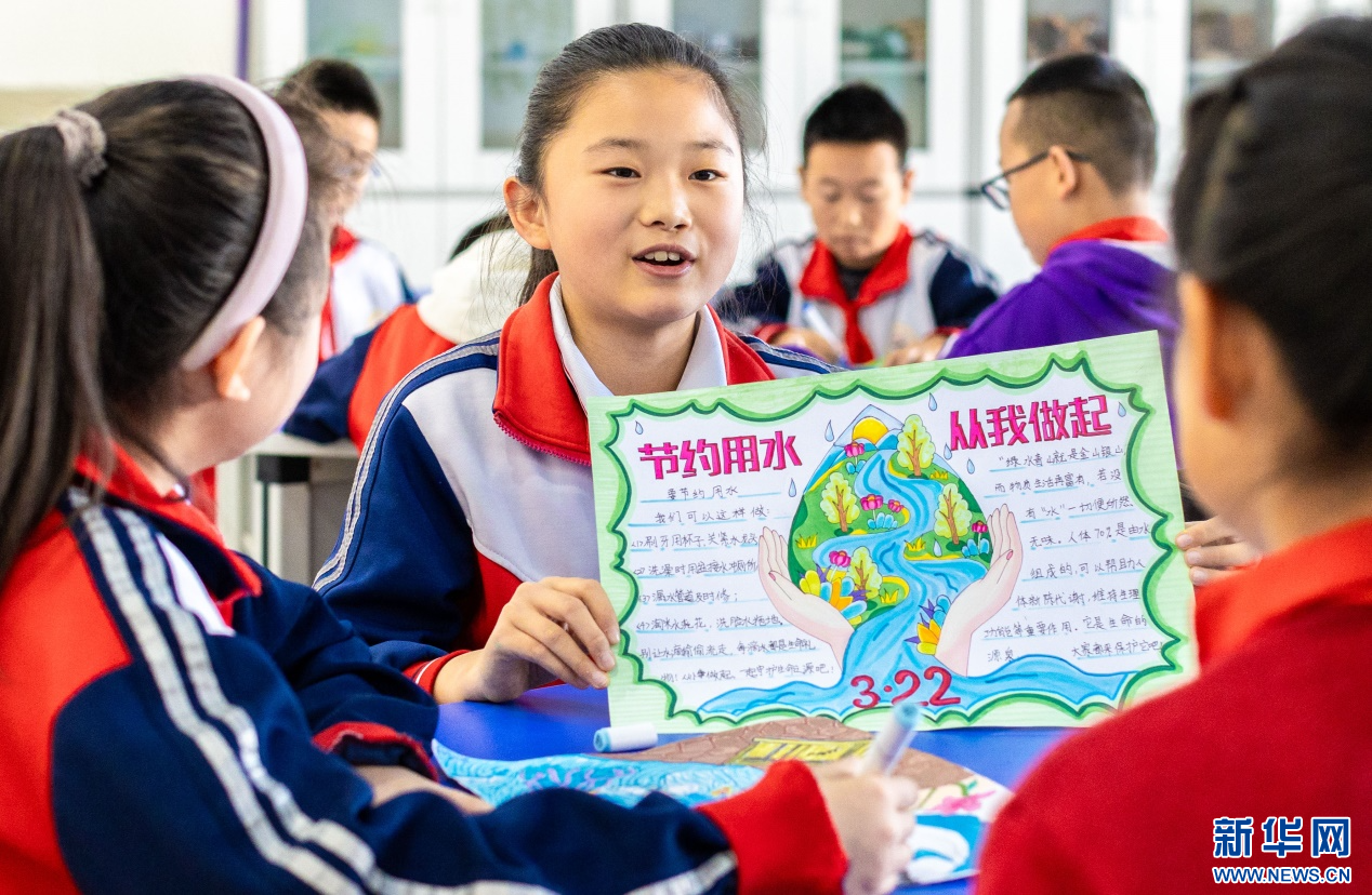??3月20日,呼和浩特市玉泉區(qū)石東路小學學生在班隊會上分享節(jié)水小妙招。新華網(wǎng)發(fā)(丁根厚 攝)