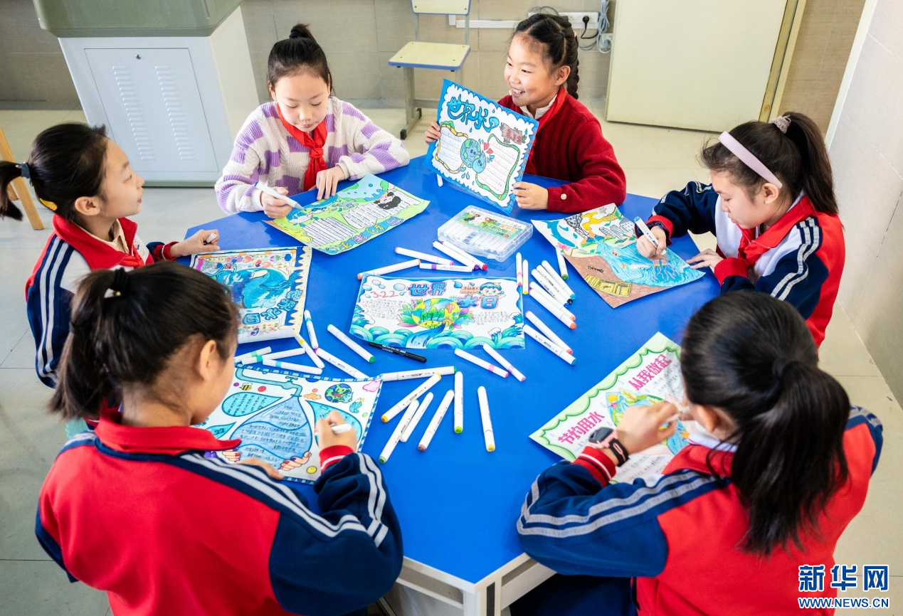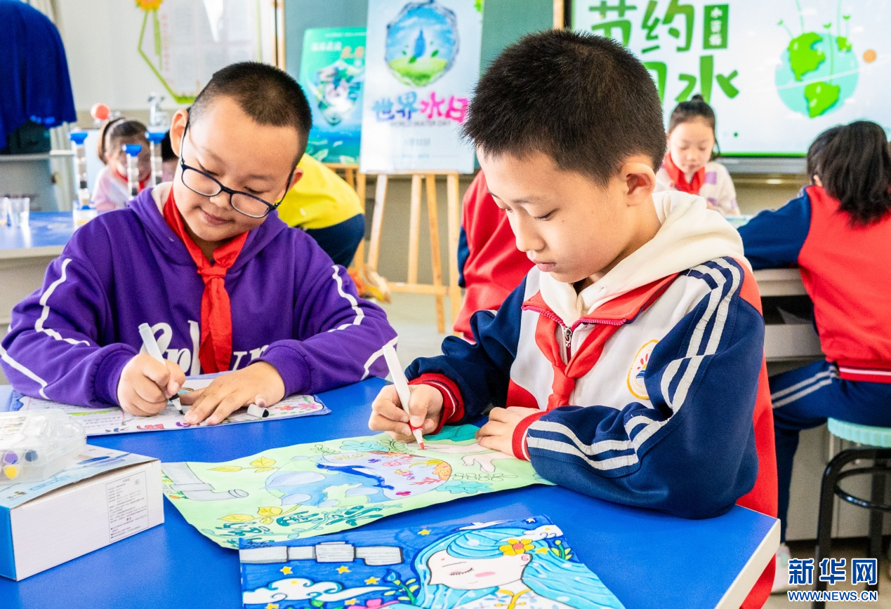 ??3月20日,呼和浩特市玉泉區(qū)石東路小學學生在繪制愛水護水手抄報。新華網(wǎng)發(fā)(丁根厚 攝)