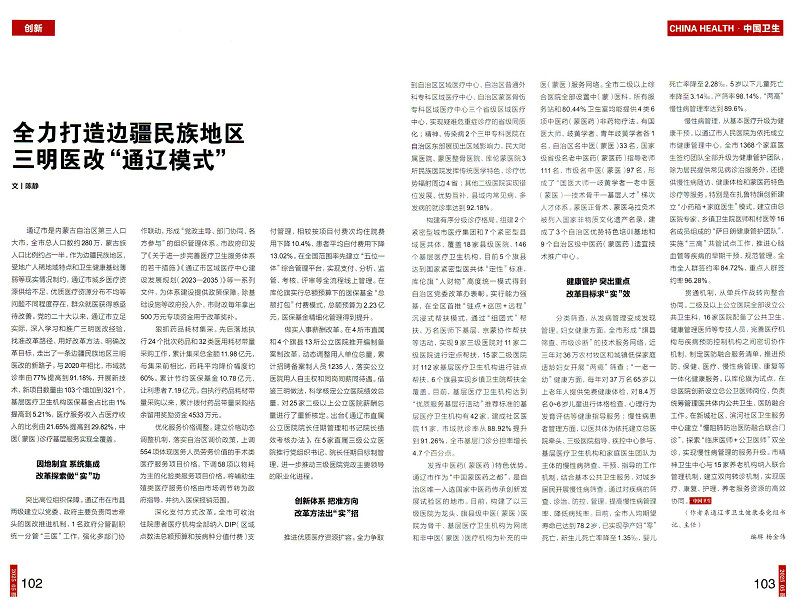 日前,《中國(guó)衛(wèi)生》2025年05期刊發(fā)了通遼市衛(wèi)健委主任陳靜同志的署名文章,深度解讀邊疆少數(shù)民族地區(qū)三明醫(yī)改“通遼模式”,這是通遼市衛(wèi)生健康工作首次受到國(guó)家衛(wèi)生核心雜志的關(guān)注,標(biāo)志著通遼在衛(wèi)生健康領(lǐng)域的創(chuàng)新實(shí)踐獲國(guó)家級(jí)權(quán)威認(rèn)可。