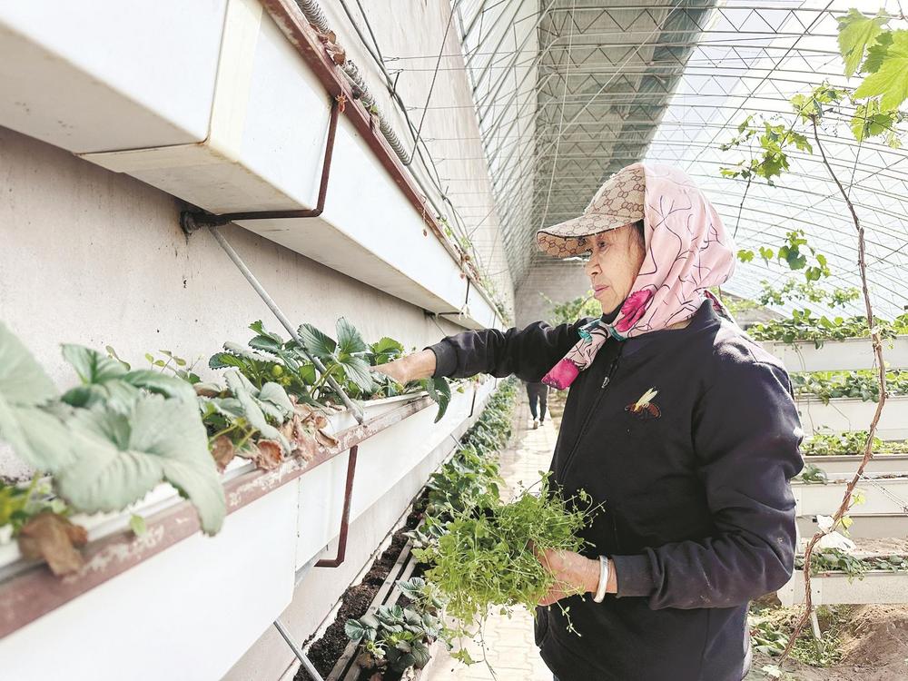 走進(jìn)草莓大棚內(nèi),濃濃的暖意撲面而來。抬眼望去,離地一米多的種植架上種滿了生機(jī)勃勃、長勢(shì)喜人的草莓;穿梭在種植架間,一顆顆鮮紅欲滴、圓潤飽滿的草莓宛如璀璨的紅寶石,從綠葉間“探出頭”來,高高地懸掛在空中,散發(fā)著誘人的清香。種植戶牛尚海正在察看采用立體栽培技術(shù)的草莓長勢(shì)情況?!斑@是一種三維立體種植方式,能夠充分利用空間和光照,大幅度提高生產(chǎn)效率。以前一畝地最多種8000株,現(xiàn)在能種2.4萬株,產(chǎn)量提高了3倍,而且草莓個(gè)頭更均勻,賣相更好。”牛尚海告訴記者,這種種植方式不僅省工、省力,還降低了勞動(dòng)強(qiáng)度,摘草莓也不用彎腰了。此外,這種種植模式比傳統(tǒng)種植模式每畝節(jié)水50%。
