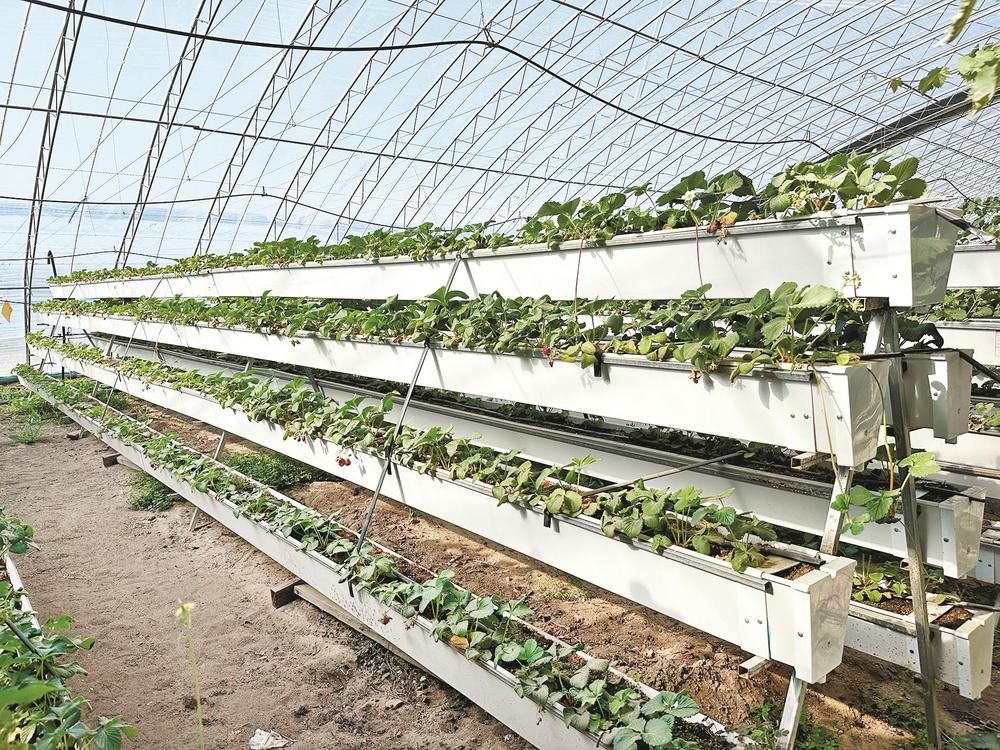 草莓在種植架上長勢(shì)良好。