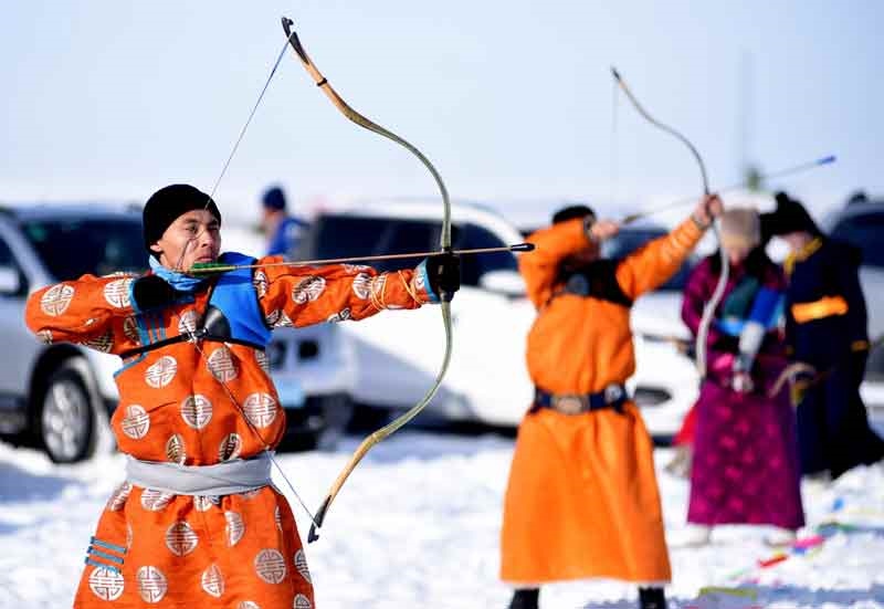 在冰雪覆蓋的草原上,成年駱駝10公里比賽、駱駝選美及128名青壯年搏克賽、射箭比賽等10余項賽事逐一上演,扮靚了寂靜的冬日草原。
