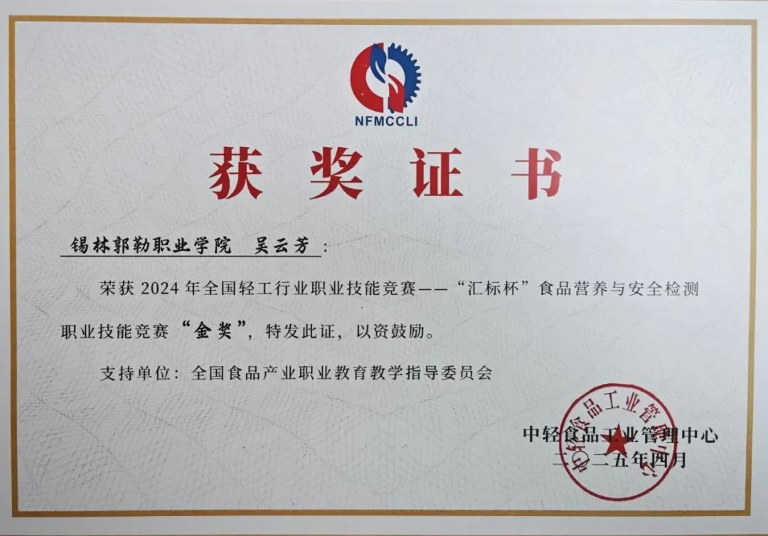 2025年4月21日,由中國輕工業(yè)聯(lián)合會、中輕食品工業(yè)管理中心、全國食品產業(yè)職業(yè)教育教學指導委員會等聯(lián)合舉辦的2024年全國輕工行業(yè)職業(yè)技能競賽——“匯標杯”食品營養(yǎng)與安全檢測職業(yè)技能競賽總決賽在廣州圓滿落幕。錫林郭勒職業(yè)學院食品檢測中心總工程師吳云芳同志榮獲金獎。