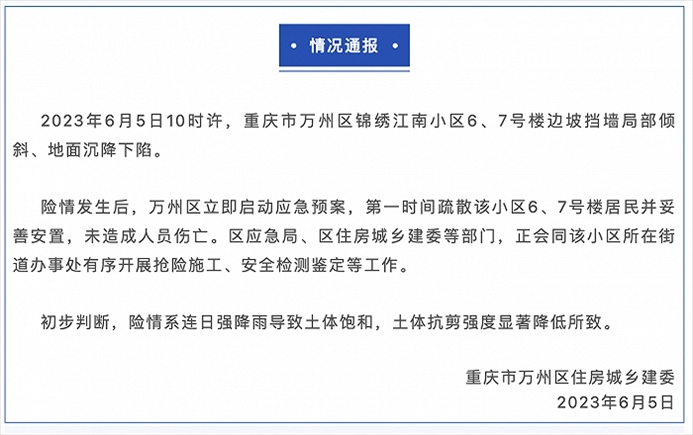 ·重慶萬(wàn)州區(qū)一小區(qū)地面沉降,官方:系連日強(qiáng)降雨所致,未造成人員傷亡。