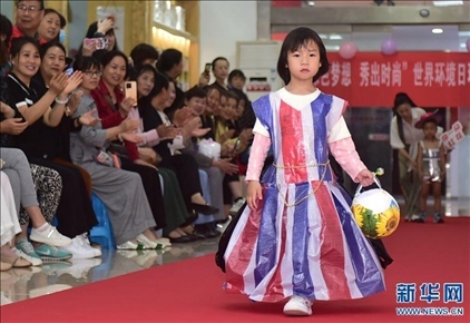 河南省洛陽(yáng)市澗西區(qū)武漢路街道武漢路社區(qū),一名小朋友在展示環(huán)保服裝。