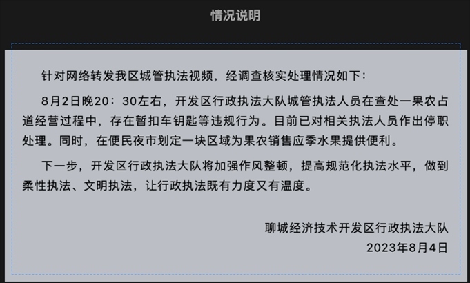 ·山東聊城通報(bào)“城管拔走小販車鑰匙”:相關(guān)執(zhí)法人員停職。