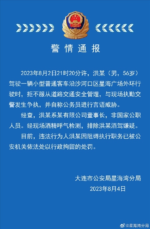 ·大連警方通報(bào)男子自稱公務(wù)員威脅交警:非公職人員,已行拘。
