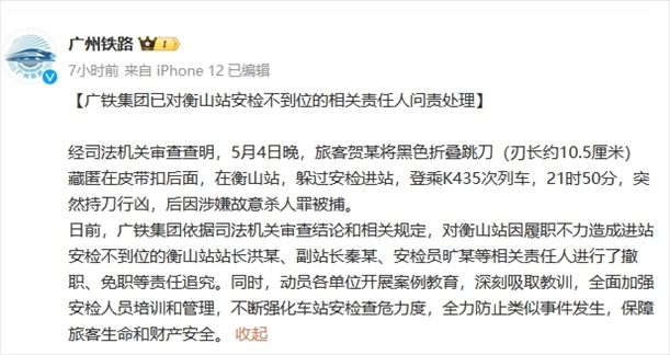 ·K435列車命案嫌犯被鑒定為精神病人,法院決定強(qiáng)制醫(yī)療。廣鐵集團(tuán):已對(duì)衡山站安檢不到位的相關(guān)責(zé)任人問責(zé)處理。