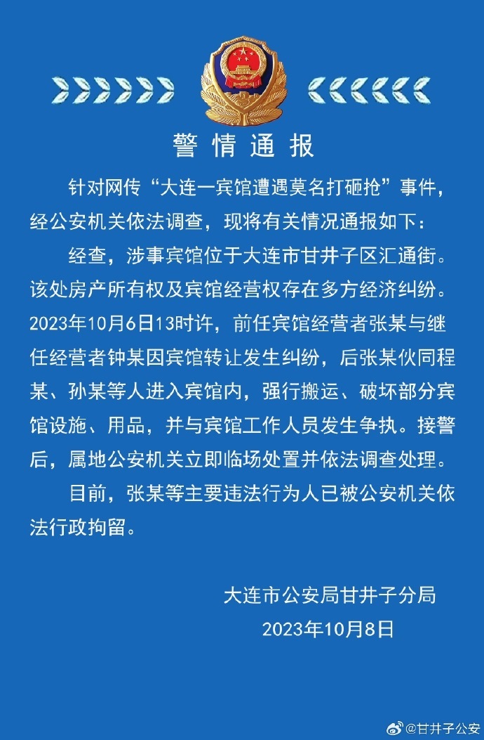 ·大連警方通報(bào)“賓館遭莫名打砸搶”:存多方經(jīng)濟(jì)糾紛,多人被拘。