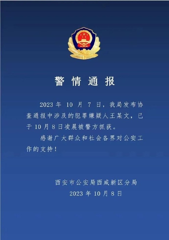 ·西安重大刑案嫌疑人王某文被抓獲。