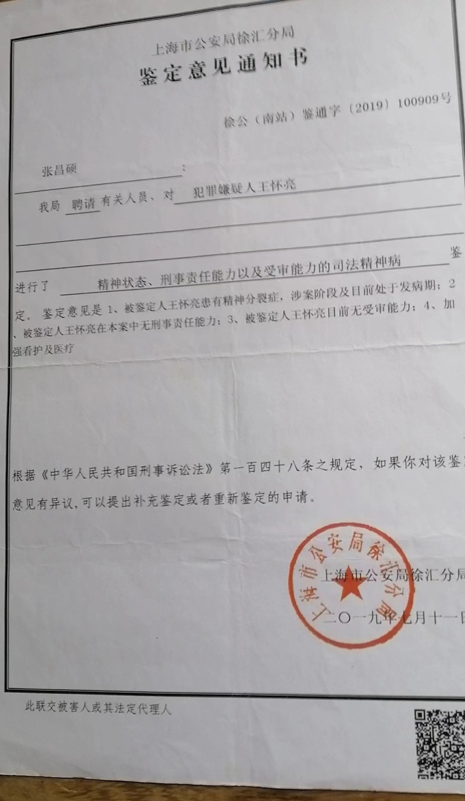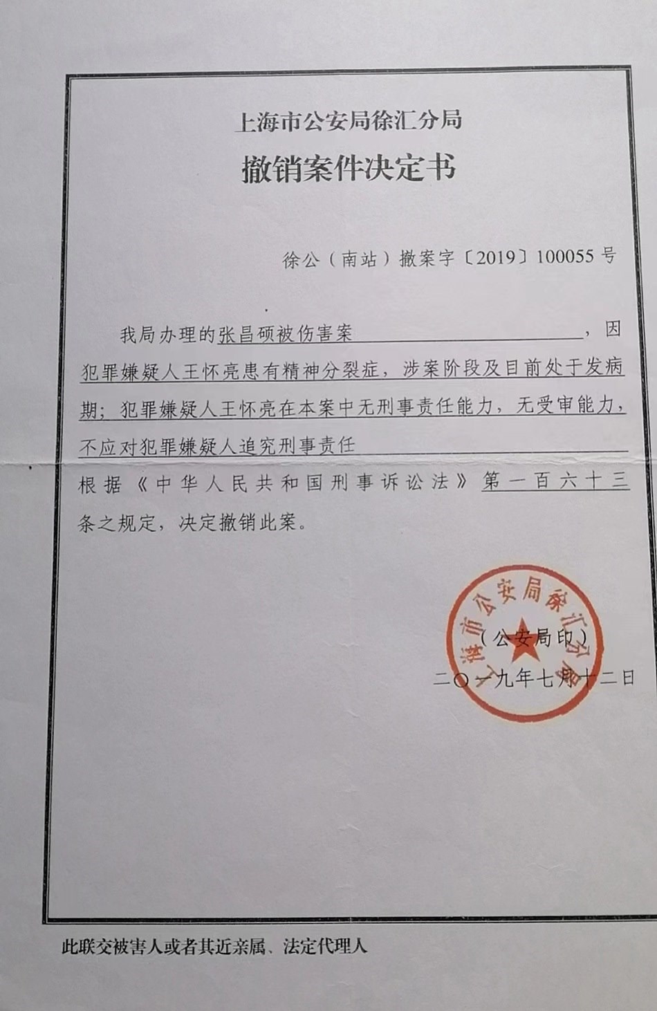 張宏銀回憶,他已經(jīng)不記得這起依法不負(fù)刑事責(zé)任的精神病人強(qiáng)制醫(yī)療程序案件開庭審理的具體時(shí)間,只記得是2019年下半年的一天上午,那天犯罪嫌疑人沒有到場(chǎng),律師也沒有到場(chǎng),檢察院的兩位人員出席了開庭。徐匯區(qū)法院當(dāng)庭做出判決:王懷亮被送往醫(yī)療機(jī)構(gòu)進(jìn)行強(qiáng)制醫(yī)療。2019年7月12日,張宏銀收到公安局的撤銷案件決定書。