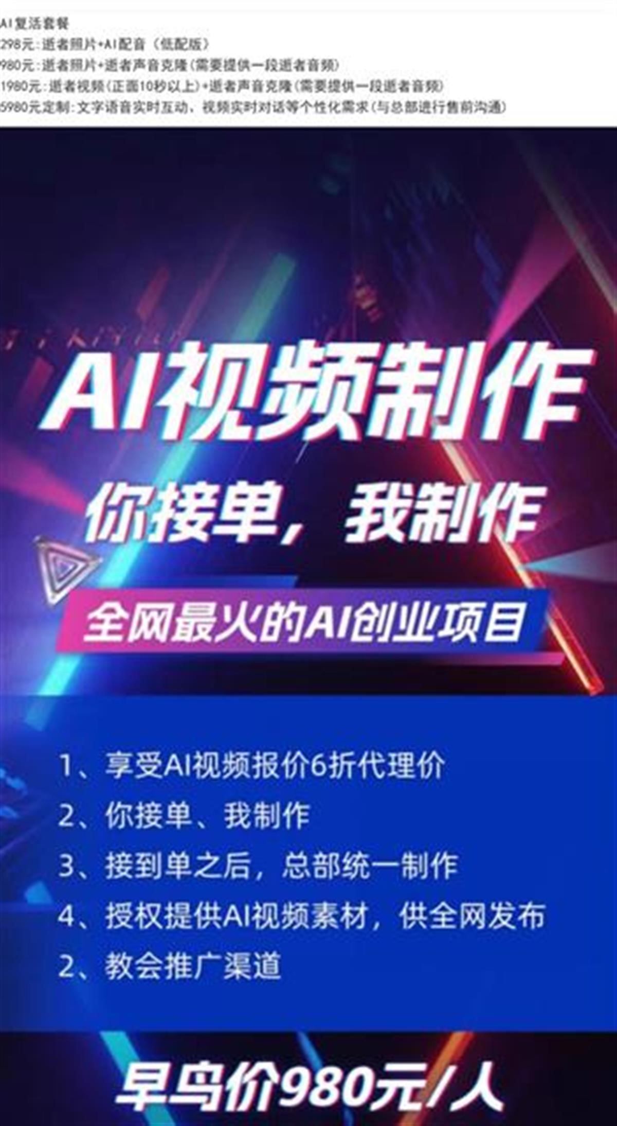 記者私信其中一名“AI復(fù)活師”詢問能否制作已逝明星的定制說話視頻,對(duì)方表示可以,且有多種模式可供選擇,需要添加微信了解詳情。對(duì)方提供的“AI復(fù)活套餐”包括“逝者照片+AI配音”“逝者照片+逝者聲音克隆”“逝者視頻+逝者聲音克隆”等服務(wù),價(jià)格從298元到1980元不等。除AI視頻服務(wù)外,這名“AI復(fù)活師”還表示正在收徒及尋找下游代理,可提供AI視頻制作教學(xué)服務(wù)。
