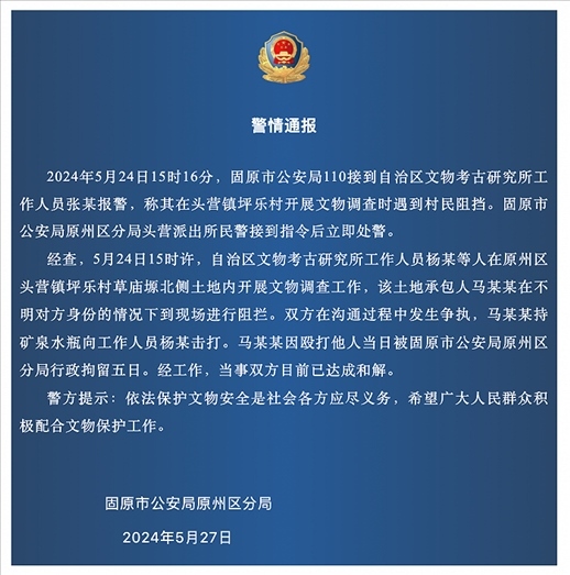 經查,5月24日15時許,自治區(qū)文物考古研究所工作人員楊某等人在原州區(qū)頭營鎮(zhèn)坪樂村草廟塬北側土地內開展文物調查工作,該土地承包人馬某某在不明對方身份的情況下到現場進行阻攔。雙方在溝通過程中發(fā)生爭執(zhí),馬某某持礦泉水瓶向工作人員楊某擊打。馬某某因毆打他人當日被固原市公安局原州區(qū)分局行政拘留五日。經工作,當事雙方目前已達成和解。