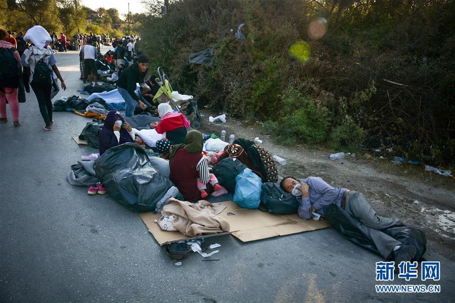9月9日,在希臘萊斯沃斯島,發(fā)生火災(zāi)后逃離莫里亞難民營的難民和非法移民在路邊休息。新華社發(fā)(帕納吉奧提斯·帕拉斯卡斯攝)