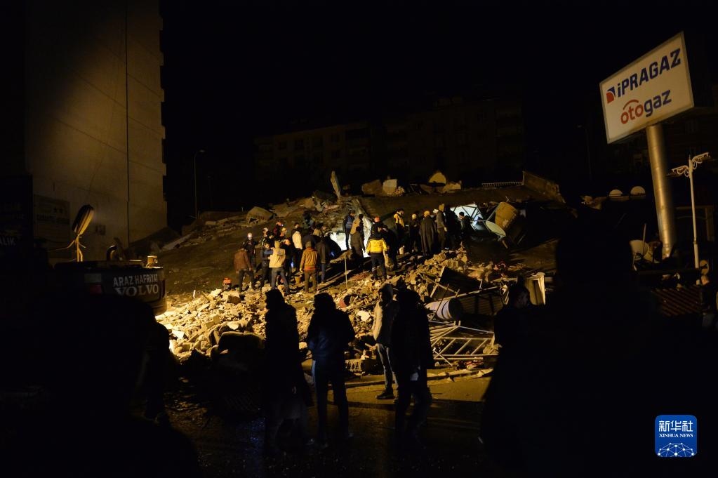 2月6日,救援人員在土耳其南部地震重災(zāi)區(qū)卡赫拉曼馬拉什省帕扎爾哲克倒塌的建筑中搜尋幸存者。新華社發(fā)(穆斯塔法·卡亞攝)