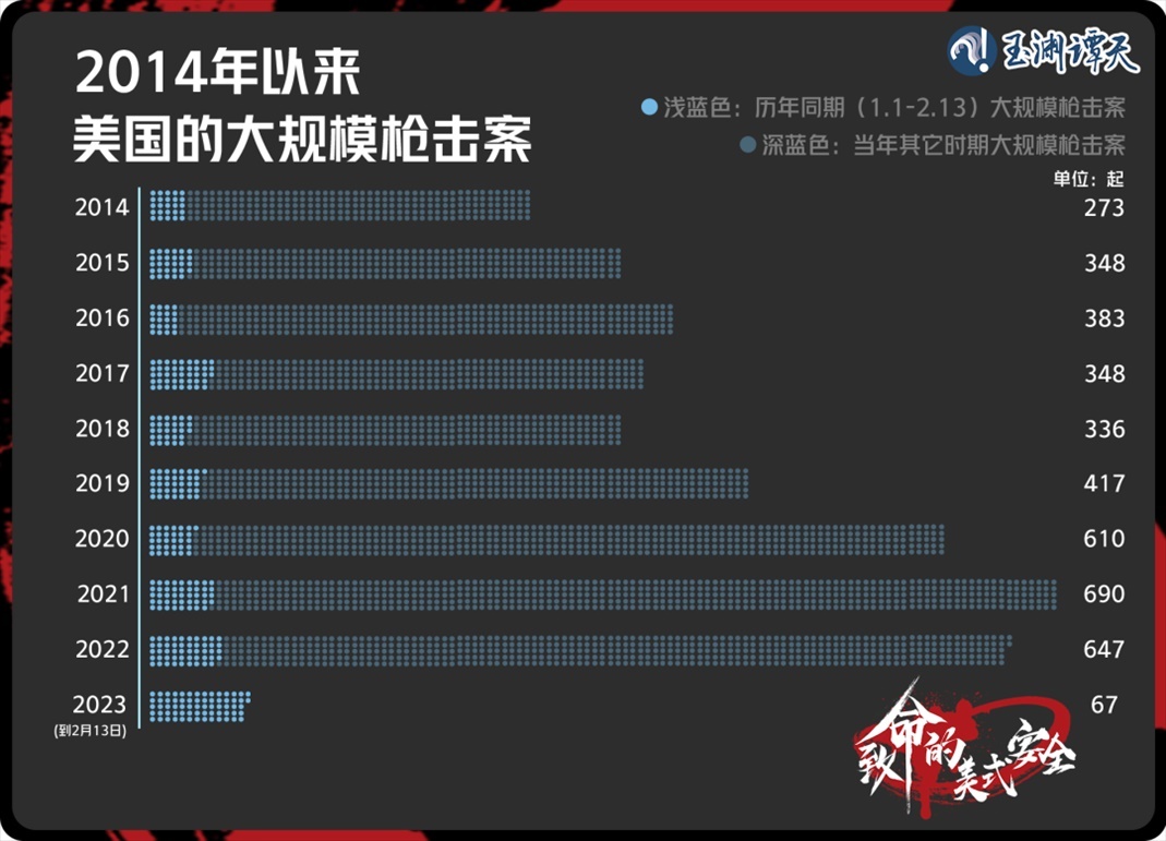 2023年開(kāi)年到現(xiàn)在,美國(guó)的大規(guī)模槍擊案數(shù)量創(chuàng)下歷史同期新高。到2月13日,美國(guó)已經(jīng)發(fā)生了67起大型槍擊案,也就是說(shuō),現(xiàn)在的美國(guó),平均每天至少要發(fā)生一起大規(guī)模槍擊案。在此期間,F(xiàn)BI飽受詬病,甚至被稱為美國(guó)槍擊案的間接推手。