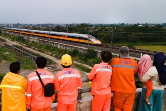 2022年11月16日,在印度尼西亞萬(wàn)隆,雅萬(wàn)高鐵建設(shè)者和當(dāng)?shù)孛癖娪^看高速鐵路綜合檢測(cè)車行駛在雅萬(wàn)高鐵試驗(yàn)段(無(wú)人機(jī)照片)。新華社發(fā)(李培養(yǎng) 攝)