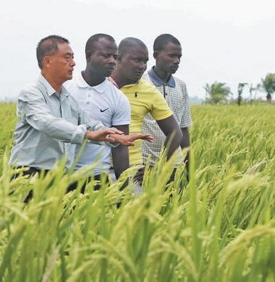 2022年10月29日,中國水稻專家但松柏(左一)在布隆迪布班扎省基航加縣指導(dǎo)當(dāng)?shù)剞r(nóng)民種植水稻。董江輝攝(新華社發(fā))