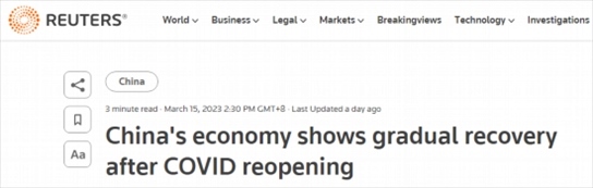 路透社也在15日的報(bào)道表示,盡管全球需求及房地產(chǎn)行業(yè)持續(xù)低迷,但2023年前兩個(gè)月中國(guó)經(jīng)濟(jì)活動(dòng)在消費(fèi)和基礎(chǔ)設(shè)施投資的推動(dòng)下穩(wěn)步回升,從疫情的影響中恢復(fù)。