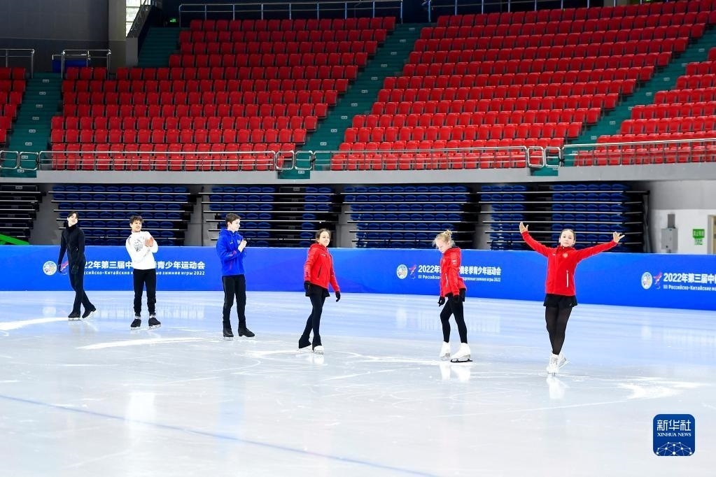在長春五環(huán)體育館,參加第三屆中俄冬季青少年運(yùn)動(dòng)會(huì)的俄羅斯花樣滑冰運(yùn)動(dòng)員在賽前場地適應(yīng)性訓(xùn)練時(shí)向場邊的中國運(yùn)動(dòng)員致意(2022年12月15日攝)。新華社記者 許暢 攝