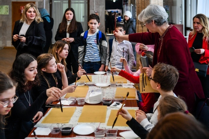 3月3日,在莫斯科國際關(guān)系學(xué)院,小朋友們在中國文化體驗(yàn)活動(dòng)上學(xué)習(xí)使用毛筆。新華社記者曹陽攝