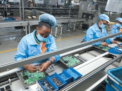 當?shù)貑T工在海信南非工業(yè)園的零配件生產車間裝配電機。 本報記者 鄒 松攝