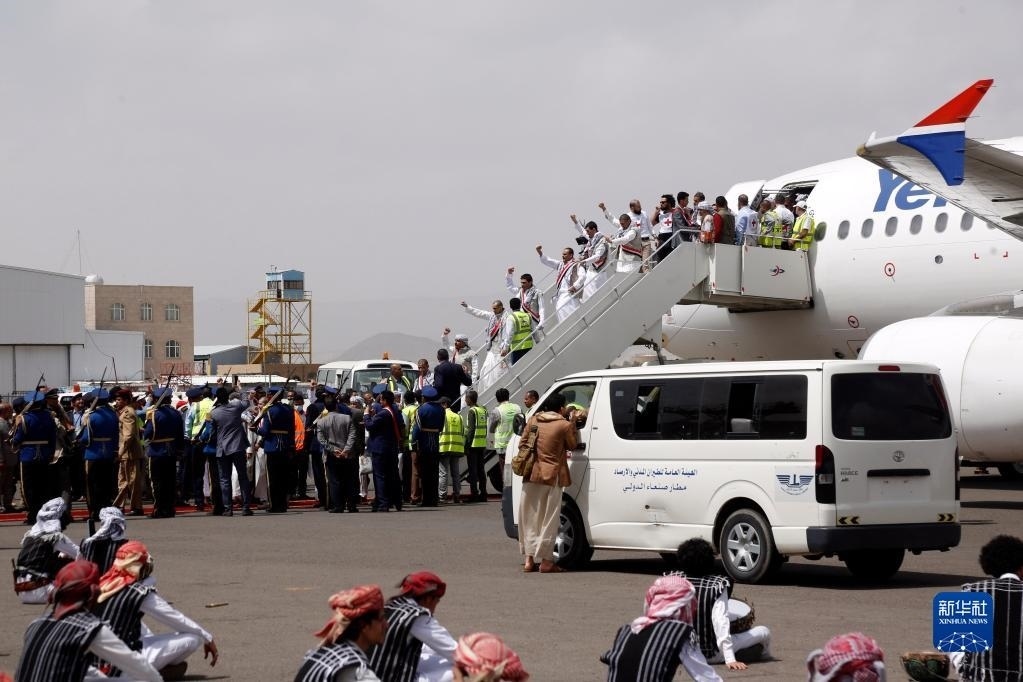 4月15日,在也門薩那機場,獲釋胡塞武裝戰(zhàn)俘走下飛機。