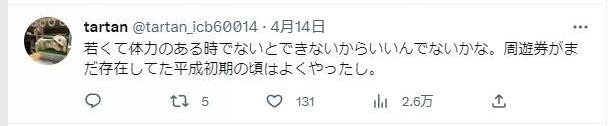 “只有年輕體力好的時(shí)候才能(這樣旅游),挺好的。在還有周游券的平成年代初期,我也這么干過?!?/p>