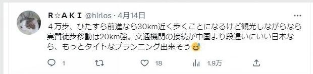 “4萬步,直線距離相當(dāng)于將近30公里,不過如果是徒步邊走邊逛景點(diǎn),差不多是20來公里。如果在公共交通更便利的日本,應(yīng)該能壓縮出一個(gè)更緊湊的行程。”