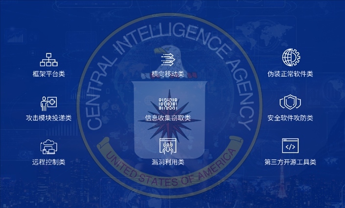 國家病毒應(yīng)急處理中心和360公司通過進(jìn)一步技術(shù)分析發(fā)現(xiàn),盡管CIA的后門程序和攻擊組件大都以無實體文件的內(nèi)存駐留執(zhí)行的方式運行,這使得對相關(guān)樣本的發(fā)現(xiàn)和取證難度極大。即使這樣,聯(lián)合技術(shù)團(tuán)隊還是成功找到了解決取證難題的有效方法,發(fā)現(xiàn)了CIA所使用的9個類別的攻擊武器,包括攻擊模塊投遞類、遠(yuǎn)程控制類、信息收集竊取類、第三方開源工具類等。