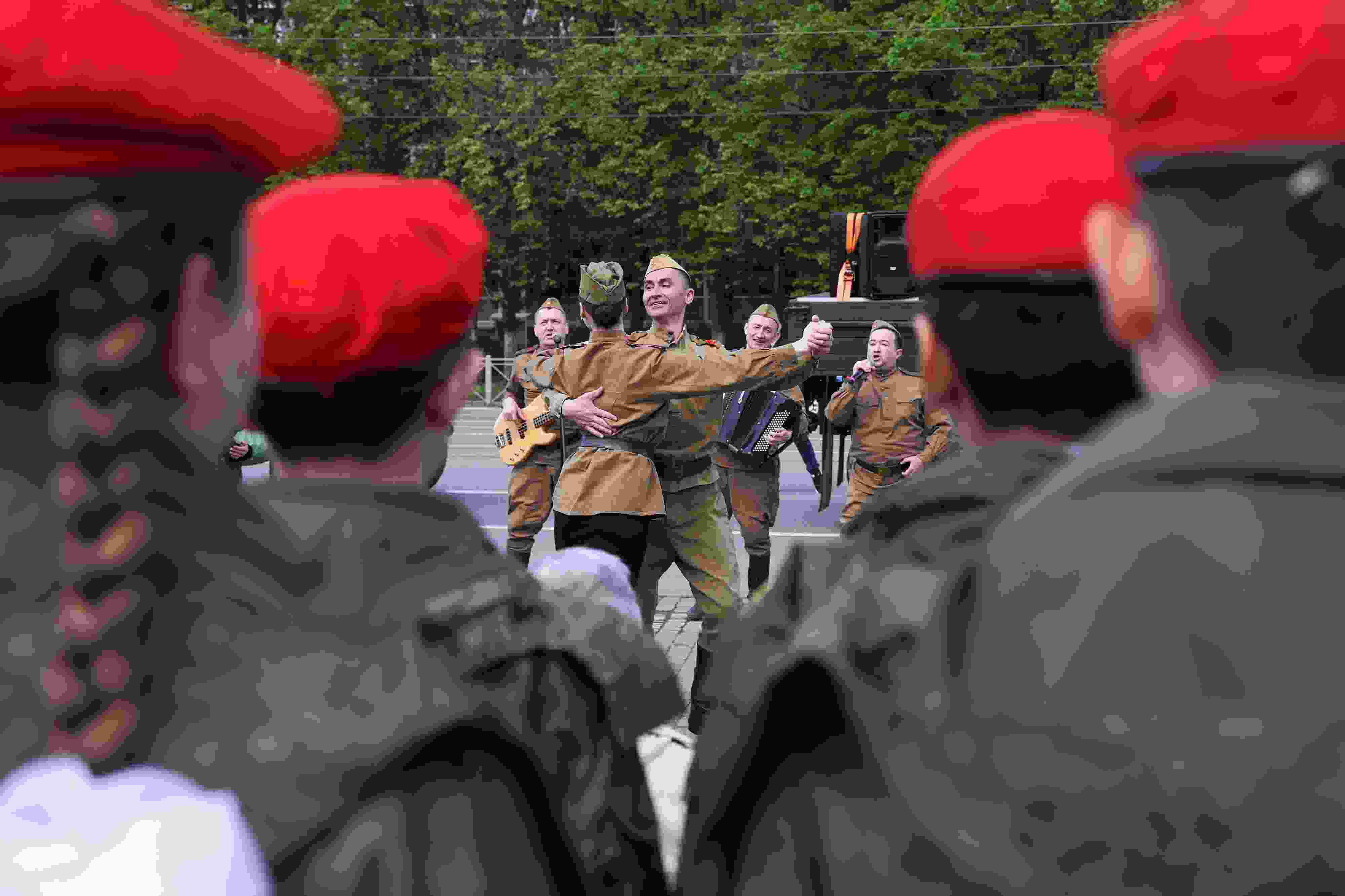當(dāng)?shù)貢r(shí)間2023年5月8日,俄羅斯莫斯科,人們?cè)诩o(jì)念二戰(zhàn)勝利78周年的音樂會(huì)上表演。蘇聯(lián)解體后,俄羅斯自1995年起,在每年的5月9日舉行衛(wèi)國(guó)戰(zhàn)爭(zhēng)勝利日閱兵式及系列慶祝活動(dòng)。 視覺中國(guó)