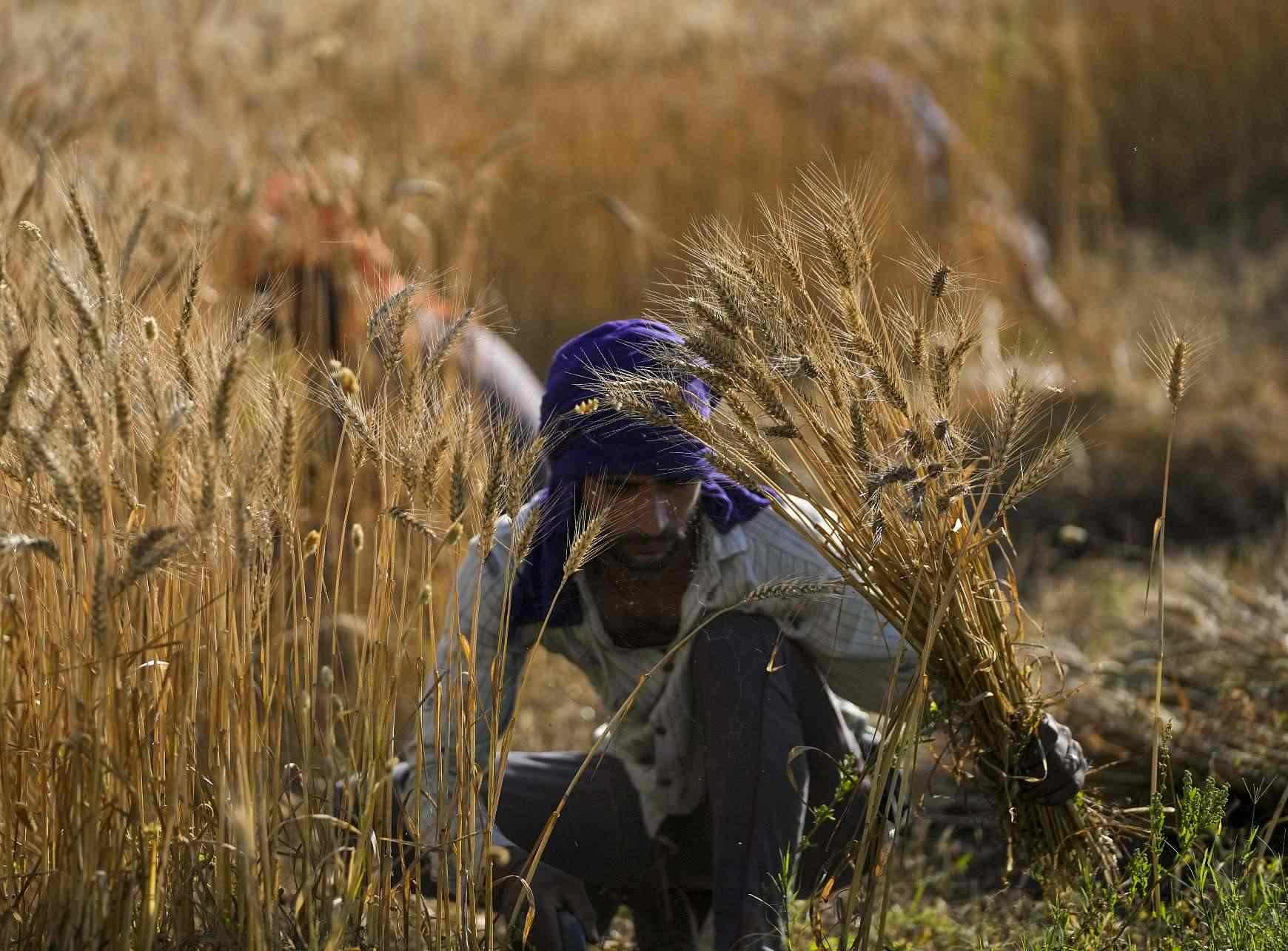 當?shù)貢r間2023年4月24日,克什米爾查謨地區(qū),農(nóng)民在收割小麥。