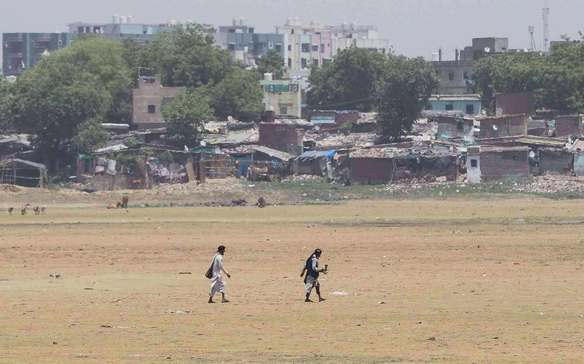 當?shù)貢r間2023年5月10日,印度艾哈邁達巴德,人們走在干涸的河床上。