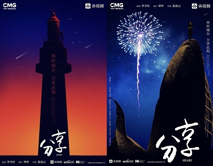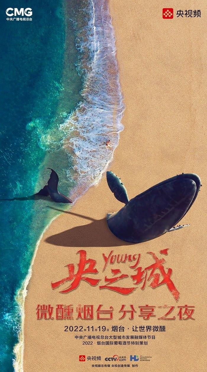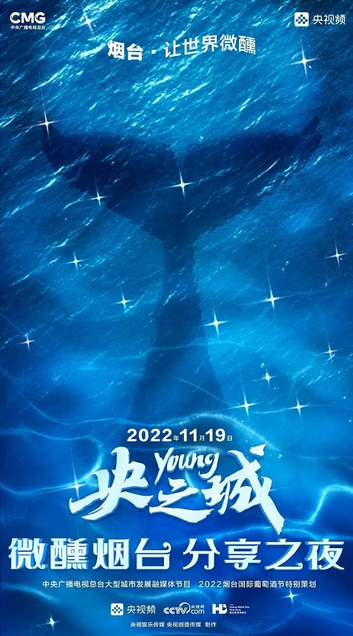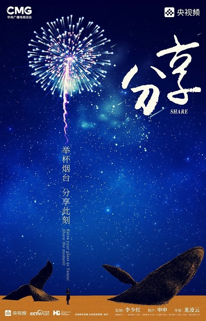 田雨峰在拍攝短片海報用圖的時候,首先確定了畫面中最突出的形象元素,同時也是交代短片故事發(fā)生地的地標性雕塑——“孤獨的鯨“。這個雕塑如今是煙臺開發(fā)區(qū)金沙灘的網(wǎng)紅打卡地,網(wǎng)友為其起名”鯨落“。碩大的鯨魚從淺海處躍出海面,魚頭和魚尾凌空飛躍,其身體的一部分似藏在沙灘里。這是一個在真實生活中不會出現(xiàn)的景象,充滿了動畫般的奇幻想象,位于煙臺碧藍的海邊,又天然地帶上了一點浪漫的色彩。短片中”舉杯煙臺,分享此刻“的Slogan綴在尾聲,分享的正是煙臺這座城市獨有的沙灘、夜空、煙火和人間。短片中可以娓娓道來般逐漸交代,但在海報里,二環(huán)用畫面底部金色沙灘上”孤獨的鯨“,畫面上方如大海般湛藍的星空,星空中綻放的煙花,鎖定了地球上唯一的煙臺。田雨峰鏡頭中短片主角的人物照被二環(huán)拼貼到童話般色彩斑斕的畫面里,被著意縮小了的黑色小女孩于是成為一切奇幻、浪漫想象的迸發(fā)之源,和世界分享一個妙趣橫生的想法。