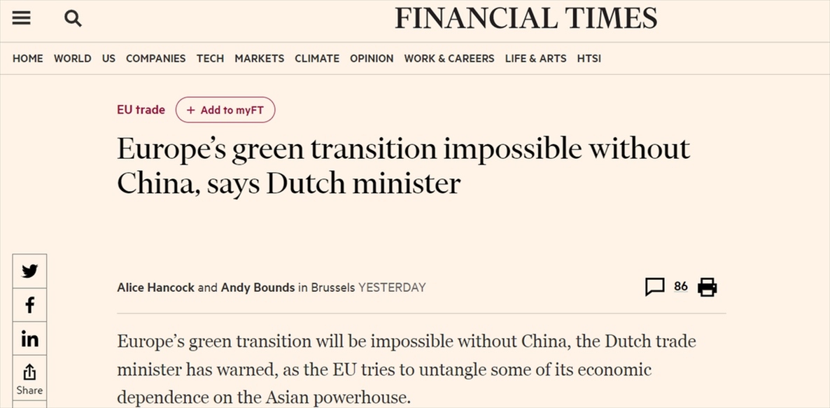 英國《金融時(shí)報(bào)》28日?qǐng)?bào)道稱,荷蘭外貿(mào)與發(fā)展合作大臣施賴納馬赫爾警告稱,沒有中國,歐洲的綠色轉(zhuǎn)型將無法實(shí)現(xiàn)。