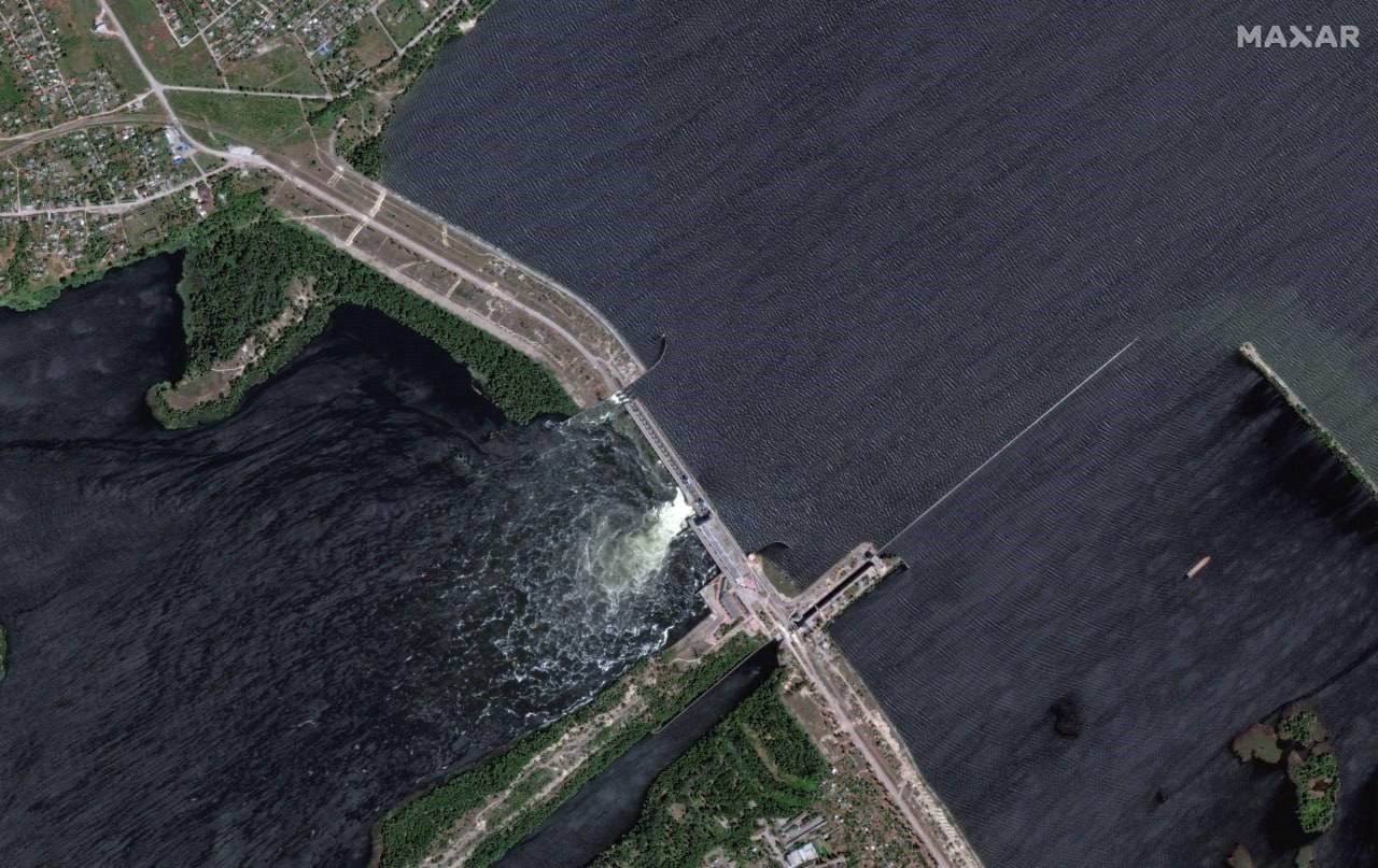 △衛(wèi)星圖像顯示的卡霍夫卡水電站大壩現(xiàn)狀(圖片來源:烏克蘭24頻道)