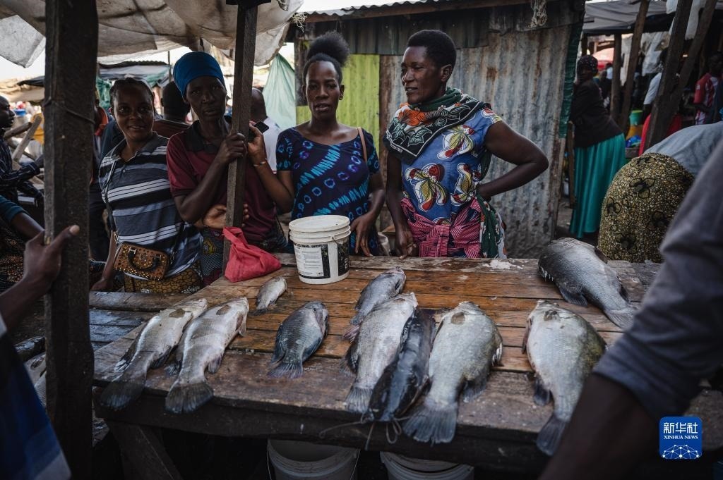 6月11日,人們?cè)谔股D醽喣啡f(wàn)扎省維多利亞湖畔附近賣魚(yú)。