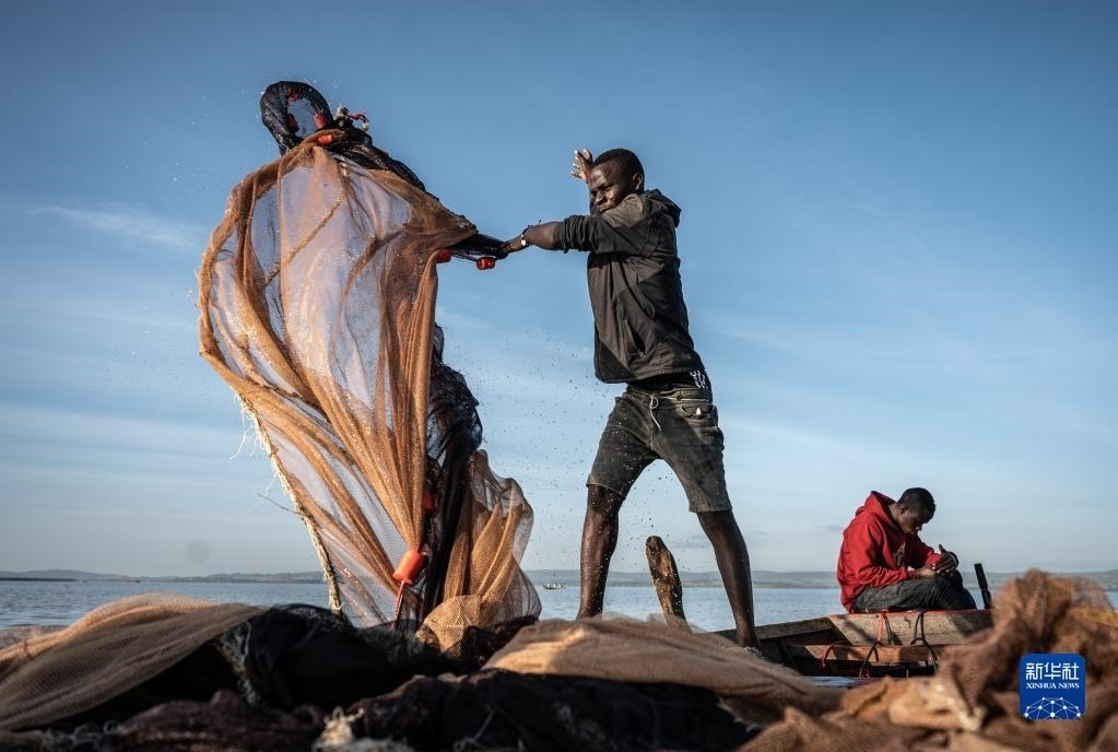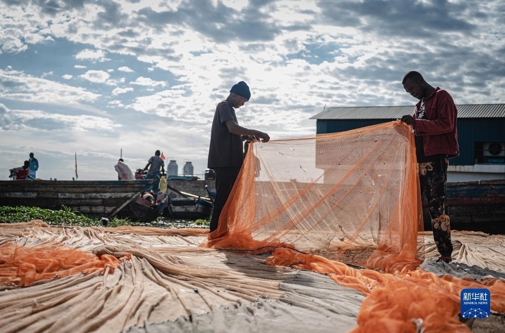 6月10日,坦桑尼亞姆萬(wàn)扎省維多利亞湖畔的漁民整理漁網(wǎng)。