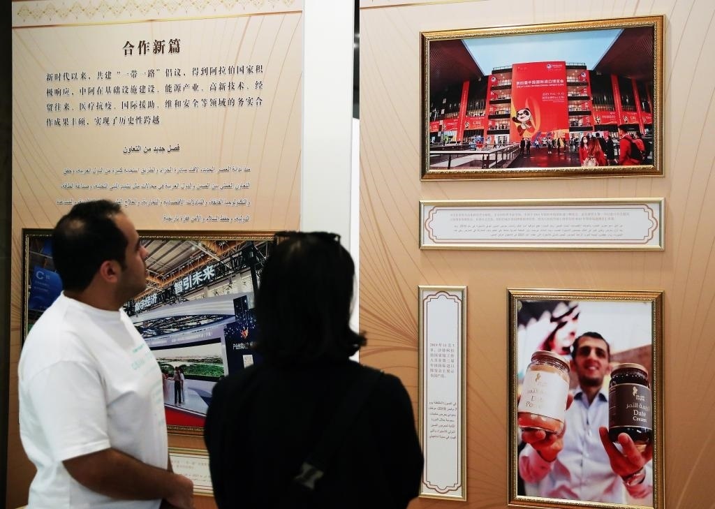 ?2022年12月7日,人們?cè)谏程匕⒗锥祭诺门e辦的中阿友好合作交流展上參觀。新華社記者王東震攝
